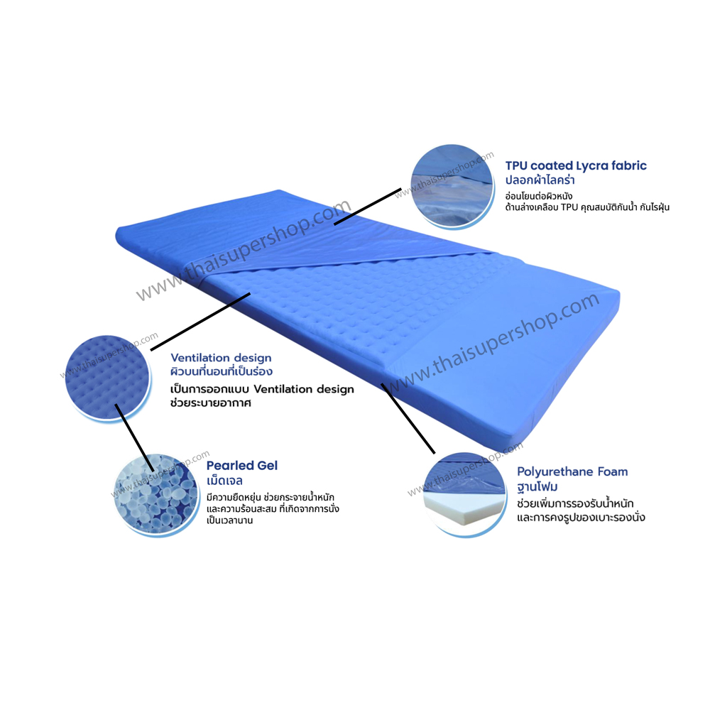 - ชั้นบนบุด้วยเม็ดเจลขนาดเล็กมีความยืดหยุ่น ช่วยกระจายน้ำหนักและความร้อนสะสมที่เกิดจากการนอน